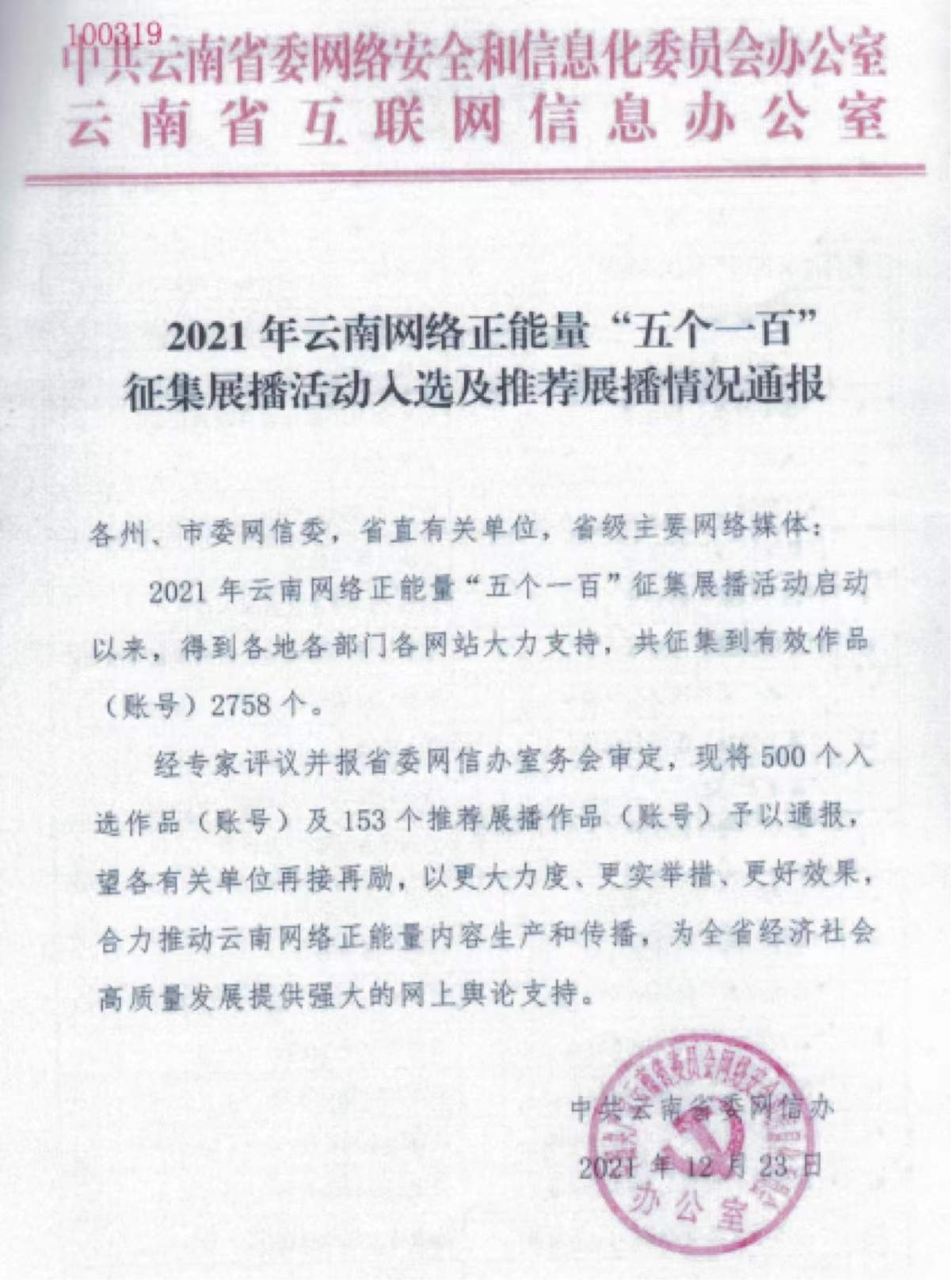 2021年云南网络正能量“五个一百”征集展播活动启动以来,得到各地各部门各网站大力支持,共征集到有效作品(账号)2758个。经专家评议并报省委网信办室务会审定,共有500个入选作品(账号)及153个推荐展播作品(账号)。