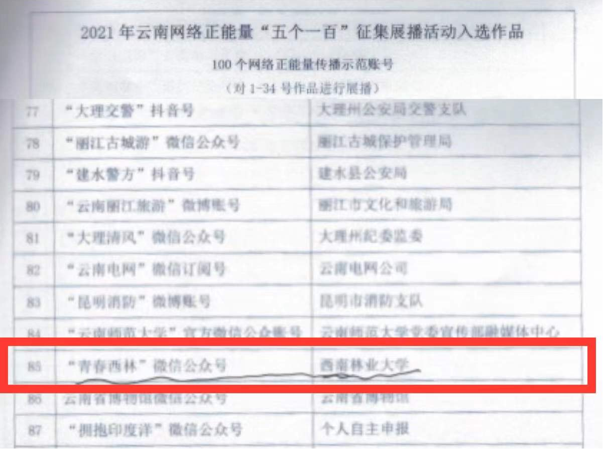 近日,中共云南省委网信办发布《2021年云南网络正能量“五个一百”征集展播活动入选及推荐展播情况通报》,米兰团委官方微信公众号“青春西林”被评为“100个网络正能量传播示范账号”。