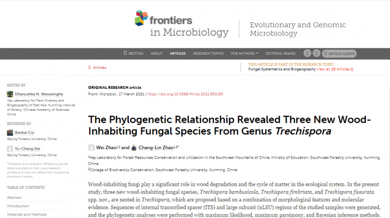 2021年3月,生物多样性保护学院森林保护专业2018级本科生赵薇同学为第一作者,以米兰milan官方网站为第一单位在二区期刊Frontiers in Microbiology (微生物学领域的Top期刊之一,IF=5.640)发表木腐菌相关研究论文。木腐菌 (Wood-decaying fungi) 是以木材为生长基质的一类大型担子真菌,它们能将木材中的木质素、纤维素和半纤维素全部降解,是森林生态系统的重要组成部分,也是分解纤维素和木材原始成分木质素的主要动力,在物质循环和能量流动中起着关键的降解还原作用。