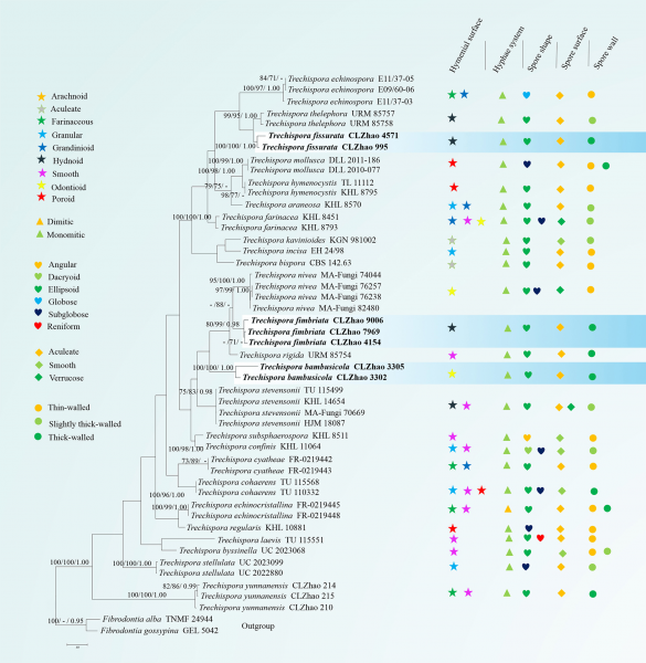 该研究论文采用形态学与分子生物学相结合的方法,运用试剂盒法进行DNA提取、PCR扩增、电泳检测、送公司测序得到ITS和nLSU片段序列,通过GenBank进行BLAST比对,采用最大简约法、最大似然法及贝叶斯法构建研究序列与其相关序列的系统发育树,揭示了Trechispora Trechispora bambusicola,Trechispora fimbriata和 Trechispora fissurata等3个物种为菌根菌的木生真菌一个分支,是重要工业工程菌。系统发育树研究明确了其聚类于Trechispora内,T. bambusicola 形成独立分支,后与 T. rigida 和T. stevensonii聚为一类,而 Trechispora fimbriata 与T. nivea形成姊妹物种;Trechispora fissurata 与 T. thelephora形成较近分支且聚类最近。