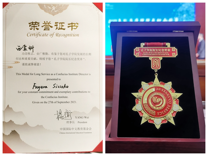 9月27日,2021年全球“孔子学院日”在北京举办。学校马里阿斯基亚中学孔子课堂外方院长Fayera SISSOKO(西索科)获授“孔子学院院长纪念奖章”,是全球首批荣获该奖章的75名孔子学院/课堂院长之一。