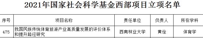 9月3日,全国哲学社会科学规划办公室正式公布了2021年国家社科基金项目的立项结果,米兰体育学院黄佺副教授牵头申报的《我国民族传统体育旅游产业高质量发展的评价体系和提升路径研究》项目喜获立项资助,实现体育学院国家社科基金资助项目零的突破。