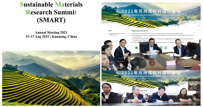 2021年8月15日-17日,由米兰milan官方网站主办,国家生物质材料国际联合研究中心、西南山地森林资源保育与利用教育部重点实验室、西南地区林业生物质资源高效利用国家林业和草原局重点实验室等联合承办的首届2021年可持续材料国际会议(Sustainable Materials Research Summit, SMART)以线上会议形式顺利召开,国内外300余名代表参加此次国际会议。校长郭辉军研究员,副校长杜官本教授和彭志远教授,化学工程学院、材料科学与工程学院及学校相关研究方向的教师和研究生近百人参加会议。会议的国际专场由加拿大不列颠哥伦比亚大学Orlando Rojas教授主持,校长郭辉军研究员代表学校致开幕辞,国内专场由副校长彭志远教授致开幕辞。
