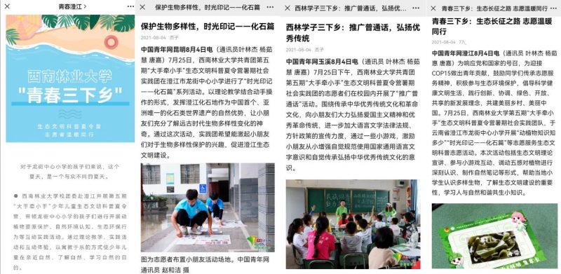 米兰共青团充分发扬“党有号召,团有行动”的优良传统,坚持围绕中心,服务大局,积极引导和帮助广大青年学生上好与现实相结合的“大思政课”,在社会课堂中受教育、长才干、作贡献,在观察实践中学党史、强信念、跟党走,努力成为担当民族复兴大任的时代新人。结合学校共青团实际和青少年特点,依托学校学科建设和实践平台优势,将大学生暑期“三下乡”社会实践活动与党史学习教育、生态文明教育、生物多样性科普、禁毒防艾科普、普通话科普、助力乡村振兴有机结合,连续五年深入开展“大手牵小手”生态文明科普夏令营社会实践活动,连续三年被评为“三下乡”社会实践活动优秀单位,着力打造高校助力生态文明建设团属品牌。(图:校团委新媒体中心/文:王世超 叶林杰/审核:杨欣/责任编辑:袁梓玥)