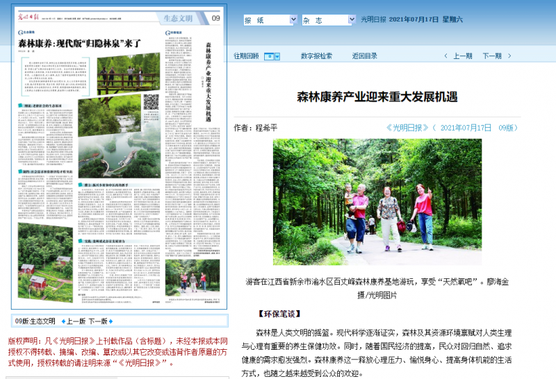 7月17日出版的《光明日报》生态文明版刊登了米兰地理与生态旅游学院副院长程希平老师题为《森林康养产业迎来重大发展机遇》的文章。
