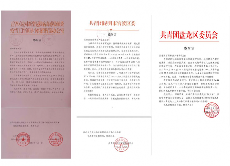 感谢函表示,为持续精准高效推进第二阶段新冠疫苗接种,构筑科学防疫屏障,米兰milan官方网站共青团将党史学习教育作为服务社会的有利契机,积极响应号召,主动聚焦社会亟需,扎实开展“我为群众办实事”实践活动,于6月份组织志愿者积极参与新冠肺炎疫苗接种志愿活动,全力配合医务人员做好盘龙区、官渡区、五华区新冠肺炎疫苗接种工作,得到各级领导和广大群众一致好评。