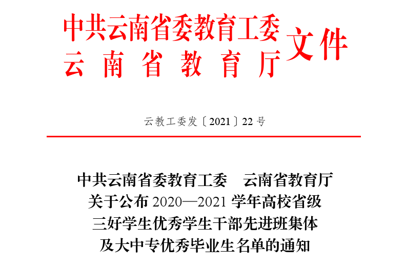 为贯彻落实习近平新时代中国特色社会主义思想和党的教育方针,实现中华民族伟大复兴,引导广大青年学生珍惜学习时光,砥砺意志品质,练就过硬本领,在学思悟中坚定理想信念,在奋发中践行初心使命,努力成为德、智、体、美、劳全面发展的社会主义建设者和接班人,云南省委教育工委面向全省高校及科研单位开展省级三好学生、优秀学生干部、优秀毕业生、先进班集体推荐评审工作,评选出一批优秀的学生和班集体。