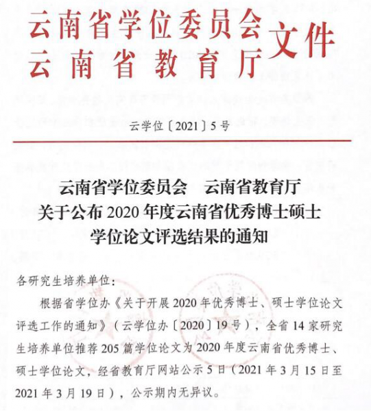 学位论文是研究生培养质量的重要标志。林业工程一级学科建设有“林产化学加工工程博士生导师团队”等云南省研究生导师团队,学科历来高度重视人才培养,不断强化研究生培养过程管理,多举措严格把关研究生学位论文质量,着力提高研究生培养质量。此次殊荣的获得,表明林业工程一级学科在持续提升研究生培养质量方面取得明显实效。(文/图:秦秀娟/审核:赵平 雷洪 狄光智/责任编辑:姜超超)