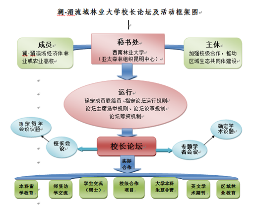 “澜—湄流域林业校长论坛”(简称“校长论坛”)将在亚太森林组织的支持下,由米兰每年定期组织举办,在“校长论坛”的框架下,通过发挥“校长论坛”的“龙头”和“纽带”作用,推进多项工作的开展。包括亚太地区发展中经济体招收本科留学生的奖学金项目,从校内选派优秀本科毕业生赴泰国朱拉隆功大学攻读硕士学位,举办澜—湄流域林业高校本科生的来华暑期夏令营,面向南亚、东南亚经济体的资访学交流,林学及其相关专业领域的英文期刊创办。面向澜—湄流域林业高校的校际合作以及区域性的林业教育研究。