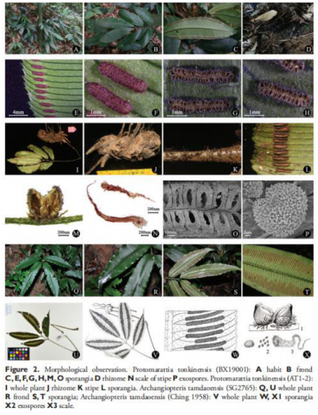 向建英项目组通过文献、形态学和分子生物学等研究手段发现,麻栗坡县采集到的孢子囊群合生的莲座蕨与Hayata于1919年发表的尖叶原始合囊蕨Protomarattia tonkinensis为同一物种,证实尖叶原始合囊蕨P. tonkinensis是存在的。项目组据此修订了尖叶莲座蕨A. tonkinensis和三岛莲座蕨A. tamdaoensis自1935年以来错误的分类学地位,相关研究结果已发表于国际权威植物分类学杂志PhytoKeys (DOI: https://doi.org/10.3897/ phytokeys.161.54912 ) 。