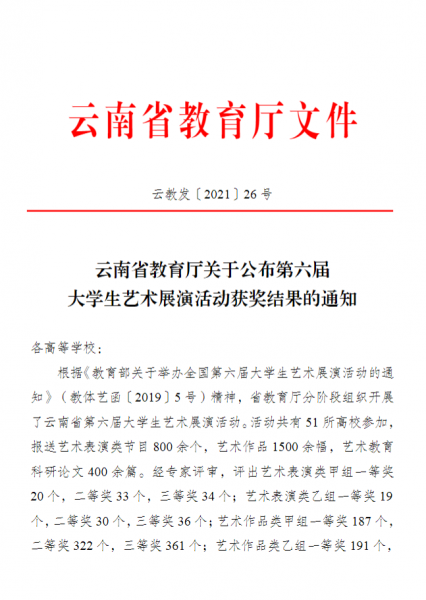 云南省大学生艺术展演每三年举办一次,是全省目前规格最高、规模最大、影响最广的大学生艺术盛会,是集中展示高校美育教育成果的重要活动。此次展演活动以“奋斗·创新·奉献”为主题,展现当代大学生与中国共产党同行、与祖国同行、与时代同行、与人民同行、与梦想同行的价值追求;展现当代大学生胸怀忧国忧民之心、爱国爱民之情,奉献祖国、奉献人民的远大理想抱负;展现当代大学生勇担时代责任、勇于砥砺奋斗、勇于创新创造,开拓进取、甘愿奉献,追求更有高度、更有品味的人生境界。