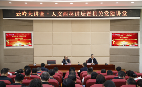 4月9日下午,学校举办“云岭大讲堂·人文西林讲坛”暨机关党建讲堂。云南省社科联党组书记、主席,研究员,云南大学博士生导师,中国科学社会主义学会常务理事张瑞才教授讲授“迈上新征程的行动指南——党的十九届五中全会精神解读”的专题党课。机关和文法学院共200余名党员参加了党课。校党委书记张昌山、校党委副书记魏宏以普通党员身份参加了此次活动。