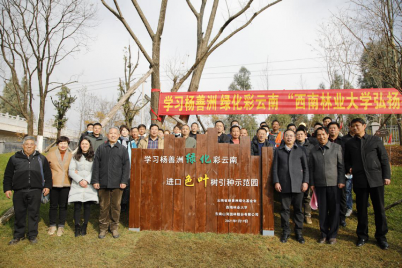 活动中,郭辉军、王德祥、王国亮、黄静为“学习杨善洲 绿化彩云南进口色叶树引种示范园”揭牌。各位参加活动的领导同志为新植入树木培土。