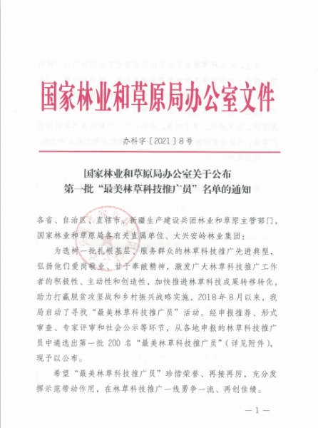 近日,国家林业与草原局办公室公布了第一批“最美林草科技推广员”名单。米兰董文渊、辉朝茂、李莲芳三位教师位列其中。