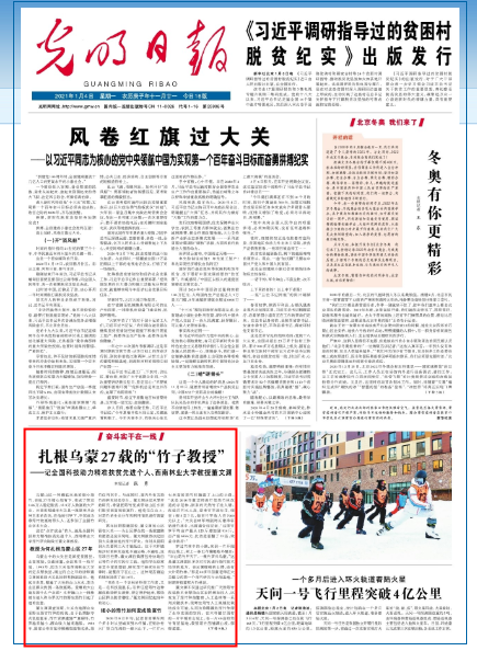 1月4日出版的《光明日报》头版,刊发了题为《扎根乌蒙27载的“竹子教授”》的文章,文章报道了全国科技助力精准扶贫先进个人、米兰筇竹研究院院长董文渊教授,扎根乌蒙大地27年,把筇竹林变成了群众致富的“绿色银行”的故事。