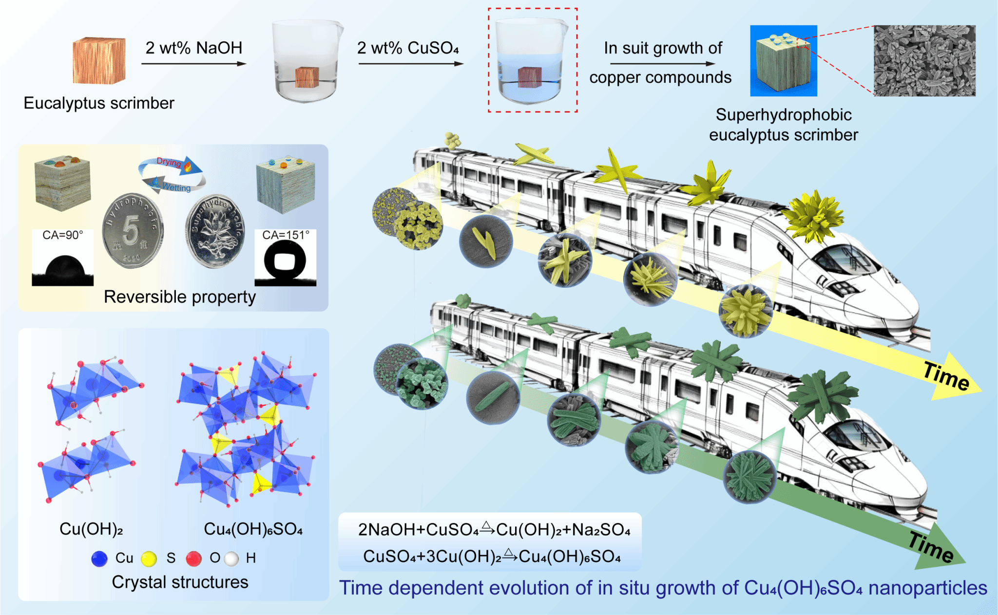 论文针对纳米颗粒在重组木表面原位生长过程和机制不明的关键科学问题,首次揭示了Cu4(SO4)(OH)6纳米颗粒在桉木重组木表面的形核细节及其原位生长过程中的尺寸演变轨迹。Cu4(SO4)(OH)6纳米花在形核阶段获得了相同的初始前驱体,在之后的生长阶段,纺锤形和长条形的纳米颗粒以不同方式自组装成纳米花结构。在改性桉木重组木表现出优异的超疏水、抗紫外、防霉、耐湿及功能可逆性。