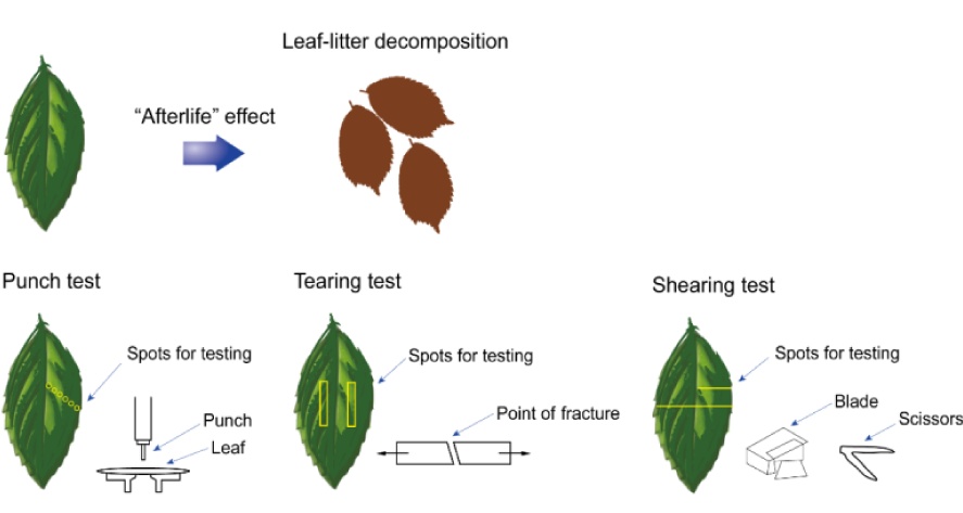 在生态系统物质循环过程中,植物凋落物分解影响养分循环和土壤碳固存。植物功能性状(plant functional traits)是调控凋落物分解的关键因子。长期以来,生态学家们关注叶片如何抵御食草动物的啃食。植物叶片的生物力学强度——穿刺、拉伸和剪切所需的力——通过“生后效应Afterlife Effect”对凋落物的可分解性产生重要影响。