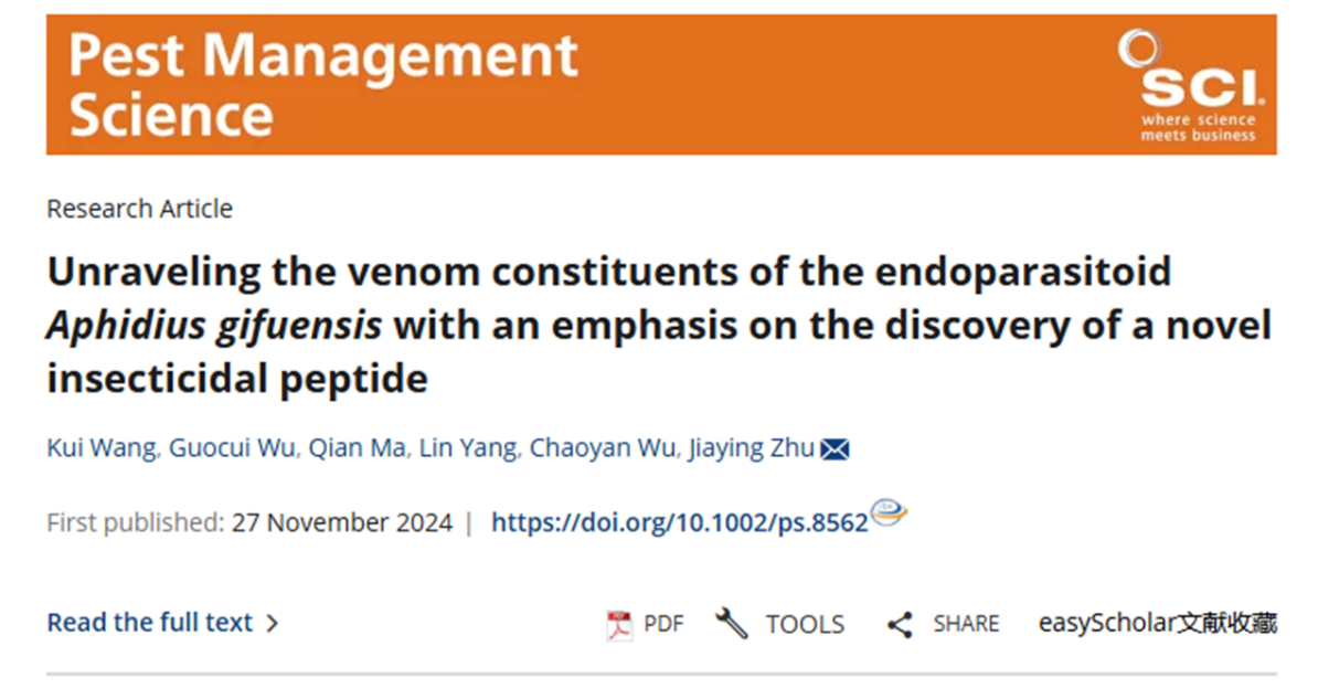相关研究结果以题为“Unraveling the venom constituents of the endoparasitoid Aphidius gifuensis with an emphasis on the discovery of a novel insecticidal peptide”发表在《Pest Management Science》(中科院一区TOP)。该论文的通讯作者为林学院朱家颖教授,博士生王岿和硕士生吴国翠、马茜为并列第一作者。硕士生杨琳与博士生吴朝妍参与了该项研究工作。该研究得到了国家自然科学基金项目(31660629)、国家林业和草原局林草青年拔尖人才项目(2019132615)、云南省“兴滇英才支持计划”青年人才后续项目以及云南省林学一流学科建设经费支持。