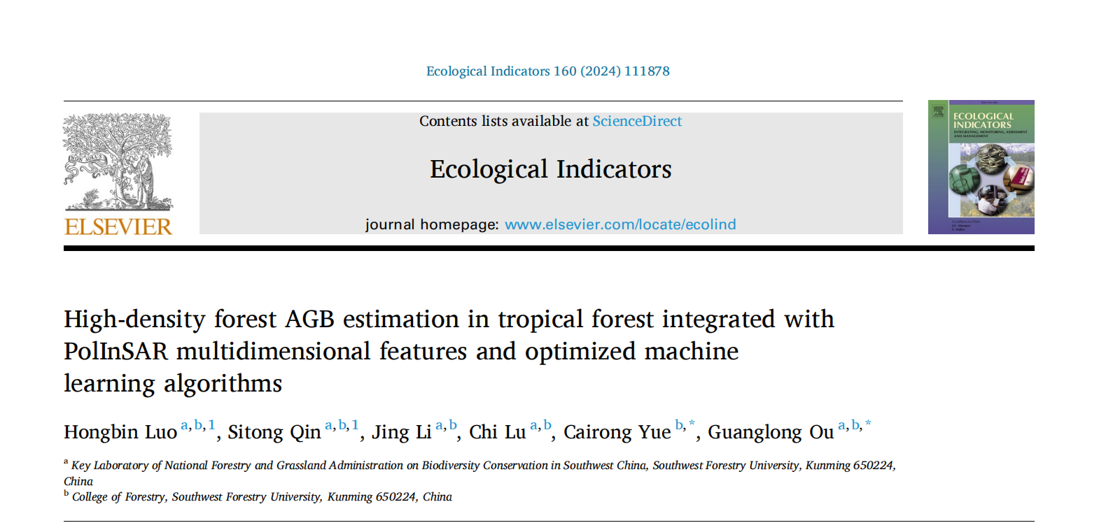 通过基线选择初步确定最合适的PolInSAR数据基线组合,基于森林冠层高度估计理论和微波穿透深度理论得到与森林高度相关的PolInSAR参数,使用全局最佳粒子群算法(GLB-PSO)优化SVR模型和RFECV变量选择方法进行AGB估计,有效提高了森林AGB估计精度。(Luo et al., 2024, Ecological Indicators, https://doi.org/10.1016/j.ecolind.2024.111878, 中国科学院一区TOP, IF=7.0)。
