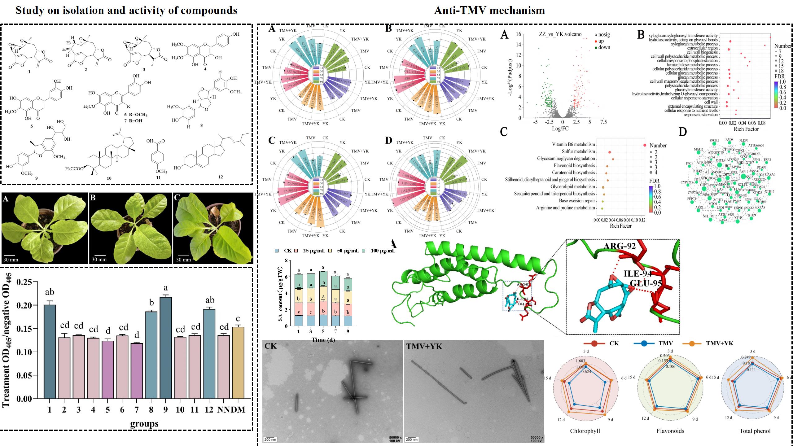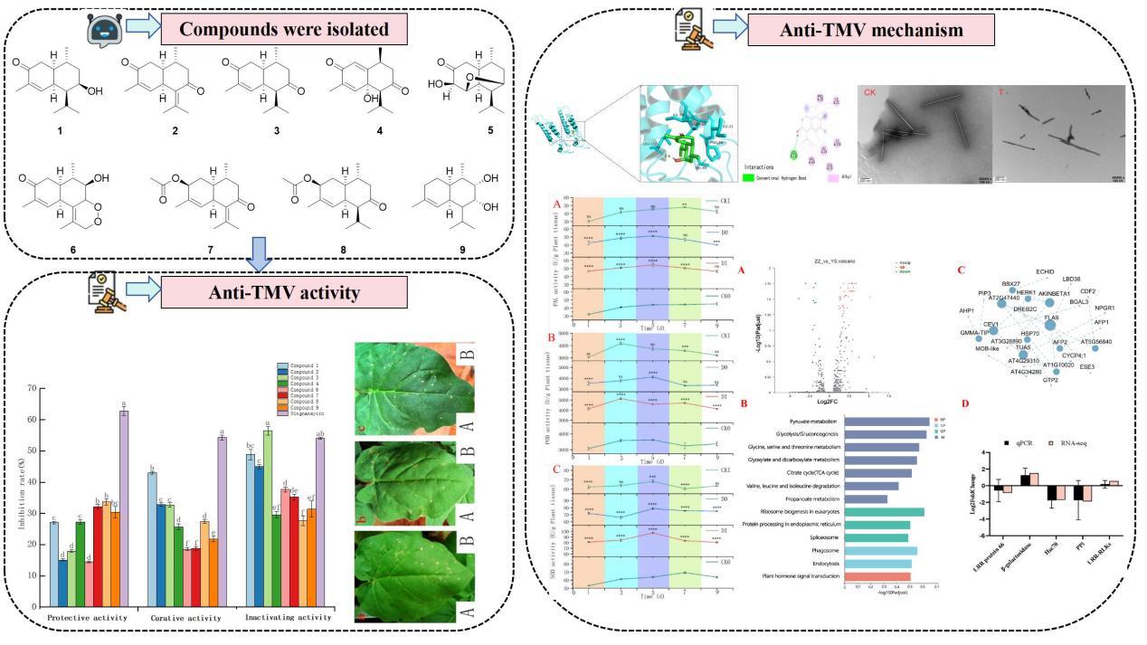 得到杜松烷型倍半萜,其中9β-hydroxy-ageraphorone抗TMV活性最优,机制研究发现化合物可通过氢键(结合 TMV 外壳蛋白 Leu132)与疏水作用破坏TMV结构。喷施化合物可激活烟草的SA信号通路,提高PAL、POD等防御酶活性,并上调MYB、LBD转录因子及抗病相关基因,增强烟草对TMV抗性。