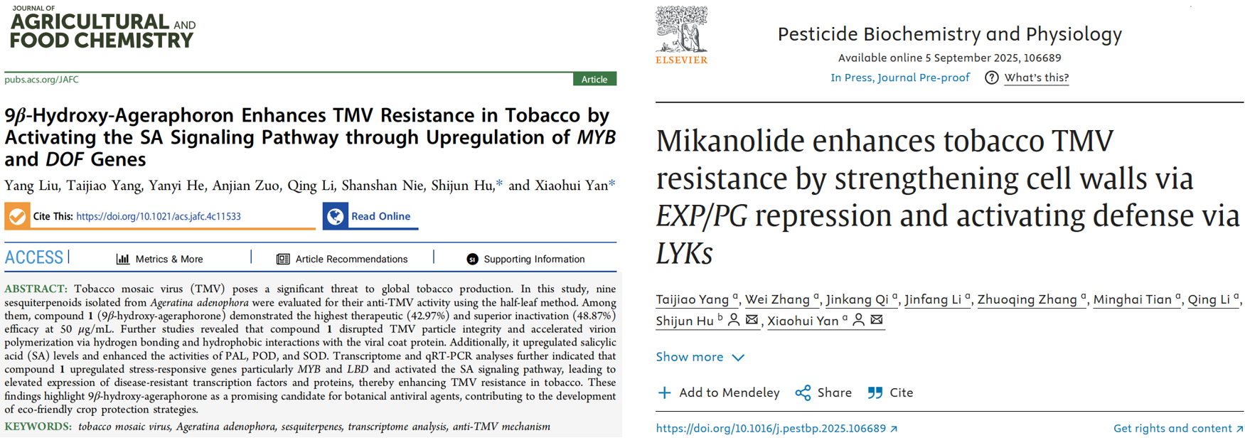 生物入侵是除生境丧失外导致全球生物多样性丧失的最重要因素。云南是生物入侵的重灾区。植物入侵尤为严重,已发现入侵植物321种4变种,隶属59科190属,其中菊科入侵种占比最多,有35属52种,包括恶性入侵种15种,给入侵地的农林生产、生态环境造成了严重危害。近日,米兰milan官方网站林学院闫晓慧教授课题组在菊科入侵植物抗病毒活性及其作用机制研究方面取得系列重要进展,先后发现紫茎泽兰和薇甘菊中的倍半萜类成分具有显著的抗烟草花叶病毒活性,并阐明了化合物的作用机制,相关研究成果分别发表于国际权威期刊《Journal of Agricultural a nd Food Chemistry》(中国科学院1区TOP,IF 6.2)和《Pesticide Biochemistry and Physiology》(中国科学院1区TOP,IF 4.2),为资源化利用恶性入侵植物紫茎泽兰、薇甘菊及烟草花叶病毒的绿色防控提供了科学依据。