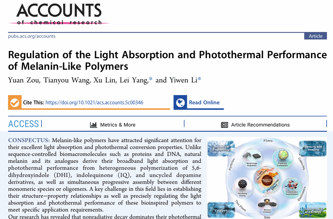 近日,米兰milan官方网站材料与化学工程学院作为第一单位,邹元老师作为第一作者,受邀于国际化学领域顶级期刊Accounts of Chemical Research上以封面论文形式发表重要综述,题为《Regulation of the Light Absorption and Photothermal Performance of Melanin-Like Polymers》。该期刊隶属于中国科学院化学1区TOP,影响因子IF=17.7。该刊仅邀请在某一研究方向取得突出成就、并形成体系性工作的国际领军学者撰稿,以呈现其课题组多年来的研究思路与重大进展。
