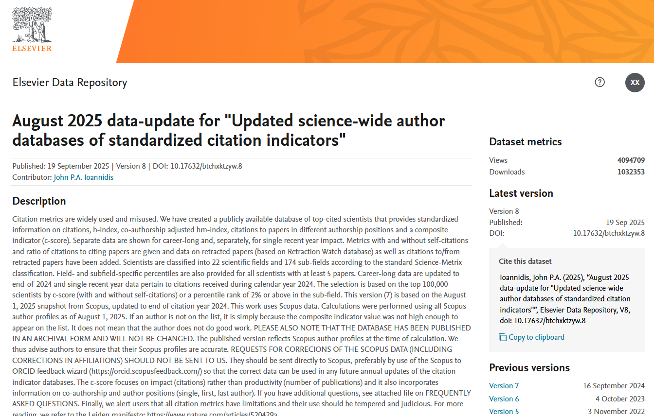全球前2%顶尖科学家榜单是基于全球近700万名科学家的论文引用数、H-index因子(用以评估科研人员的学术产出数量与学术产出水平)、合著者修正的hm因子、单独或第一作者的文章引用数等综合参数,遴选出全球排名前2%的科学家,分为22个学科领域、174个细分子学科领域,为科学家长期科研表现提供了一个衡量指标,能够更客观、更真实地反映科学家的学术影响力。