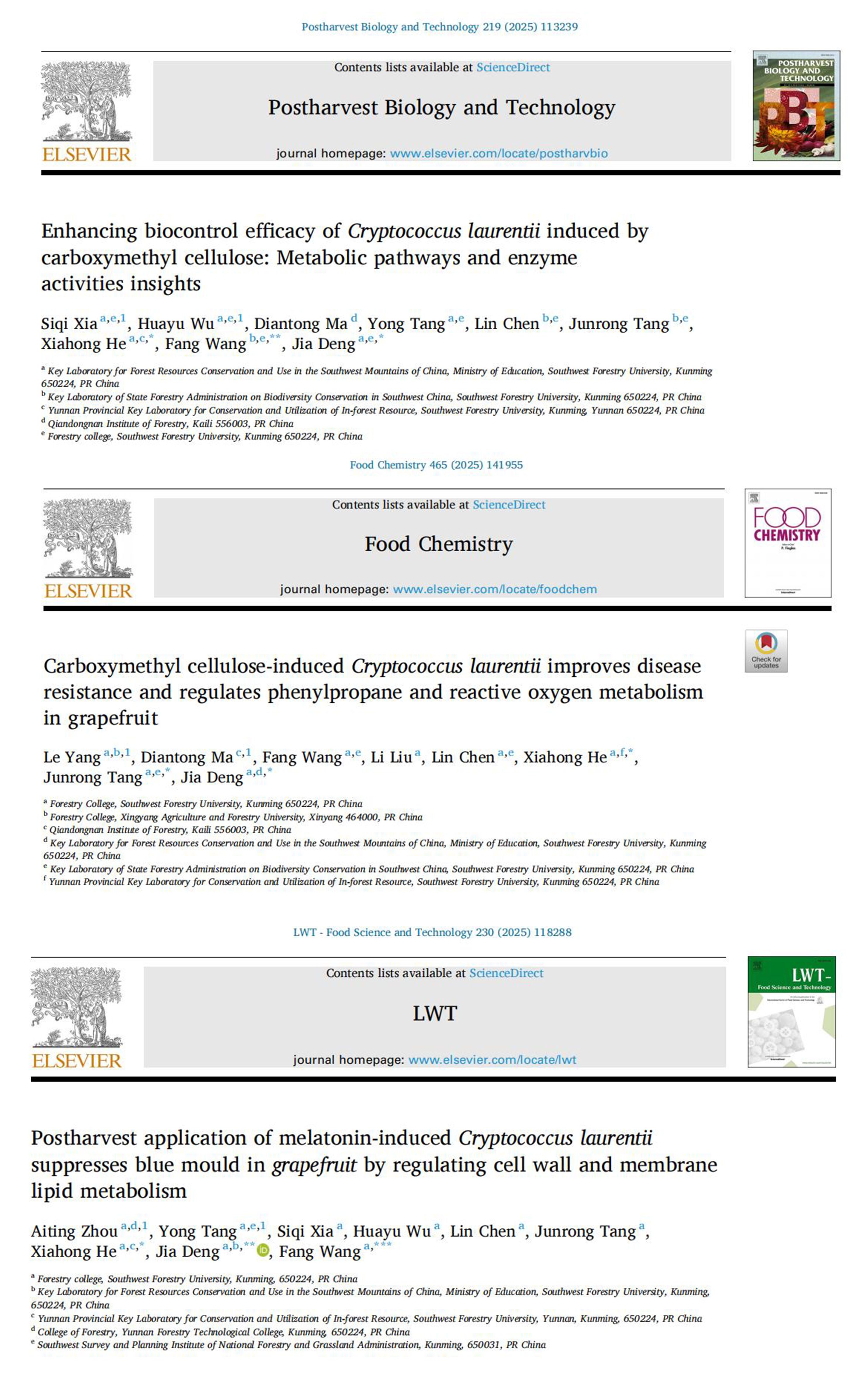 2.提出了采后病害防控从单一干预向联合多因子耦合环境调控技术的转变,阐明了复合激发子的多维协同机制,为高原特色林果绿色保鲜技术体系创新提供了理论支撑与技术实现路径。(Xia et al.,2025, Postharvest Biology and Technology, https://doi.org/10.1016/j.postharvbio.2024.113239, 中国科学院一区TOP, IF=6.8),(Yang et al.,2025, Food Chemistry, https://doi.org/10.1016/j.foodchem.2024.141955, 中国科学院一区TOP, IF=9.8),(Zhou et al.,2025, LWT-Food Science and Technology, https://doi.org/10.1016/j.lwt.2025.118288,中国科学院一区TOP, IF=6.6),(Zhou et al.,2025, International Journal of Food Microbiology, https://doi.org/10.1016/j.ijfoodmicro.2025.111192,中国科学院一区TOP, IF=5.2)