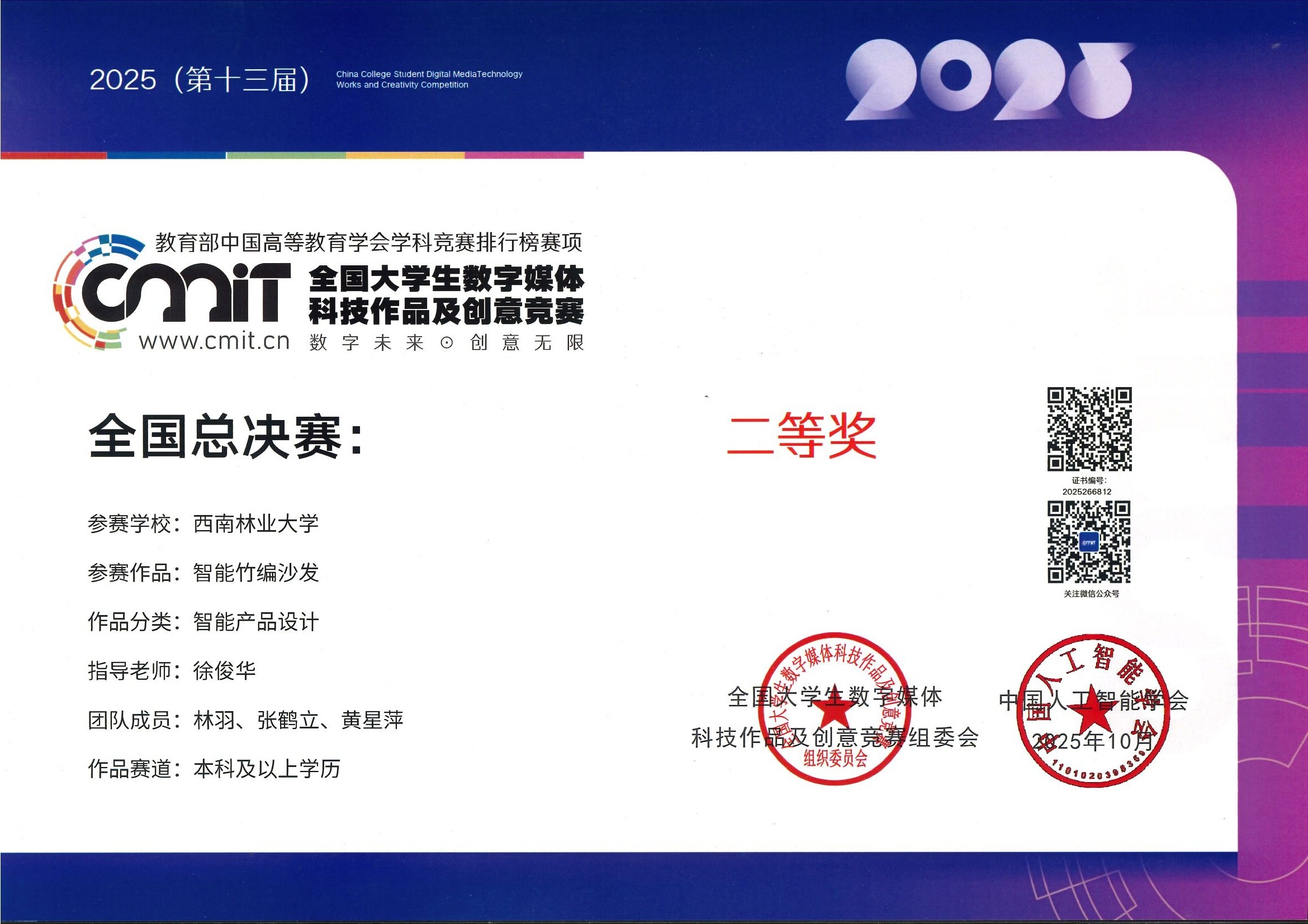 作品《高原湿地科学数据共建共享平台》由生态与环境学院(湿地学院)徐洋老师指导,环境科学2024级本科生冯明智、湿地保护与恢复2023级本科生张凯、环境科学2024级本科生宁科正同学共同完成;徐洋老师荣获优秀指导教师奖。作品《智能竹编沙发》由艺术与设计学院(艺术博物馆)徐俊华老师指导,设计专业2025级研究生林羽、张鹤立、黄星萍同学共同完成。