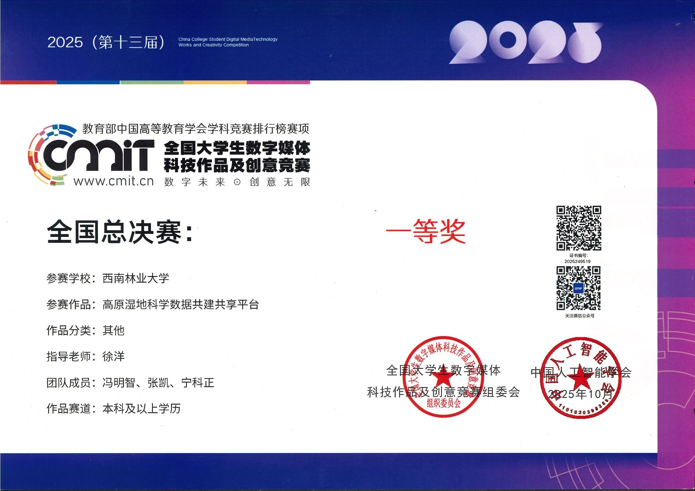 10月24日至26日,2025年第十三届全国大学生数字媒体科技作品及创意竞赛全国现场总决赛在黑龙江省哈尔滨市举行。米兰学子作品《高原湿地科学数据共建共享平台》荣获全国总决赛一等奖,作品《智能竹编沙发》荣获全国总决赛二等奖。