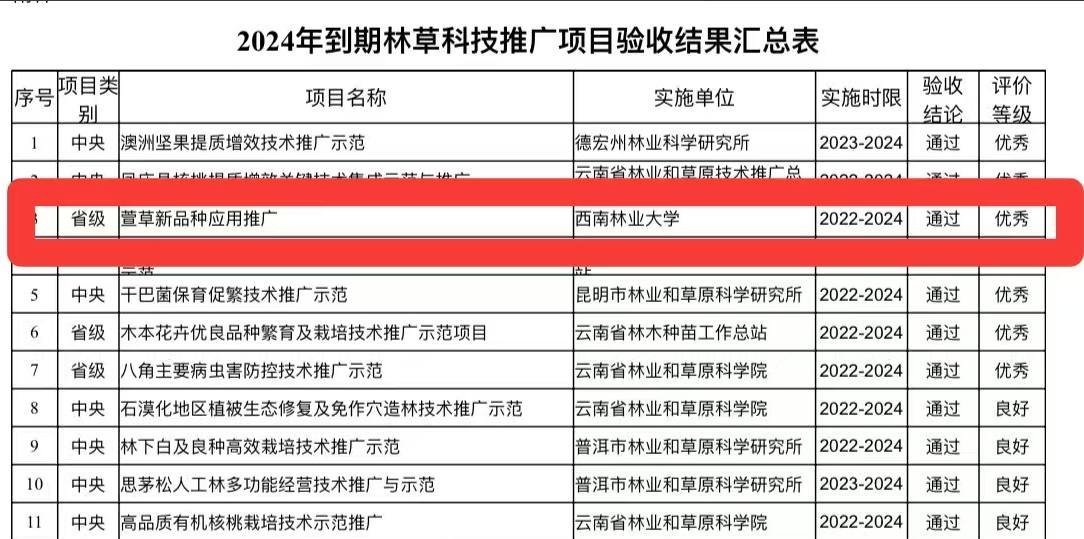 近日,云南省林业和草原局正式公布了2024年度到期林草科技推广项目验收结果。米兰辛培尧教授带领林草科技推广项目团队所承担的“萱草新品种应用推广项目”顺利通过验收,并在本次参与验收的23个项目中脱颖而出,荣获“优秀”档次,这也是本次验收中由高校作为技术支撑单位并获得“优秀”评价的唯一项目。