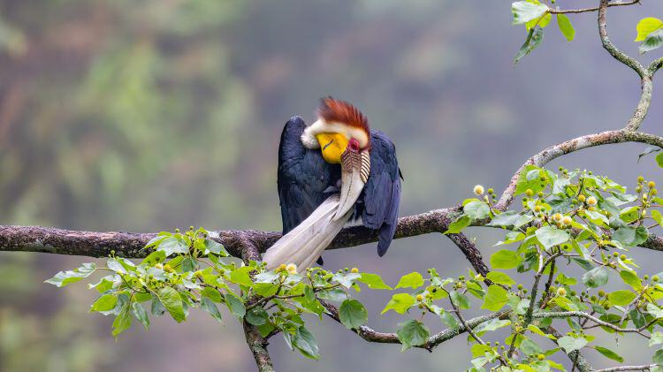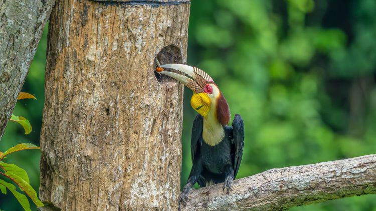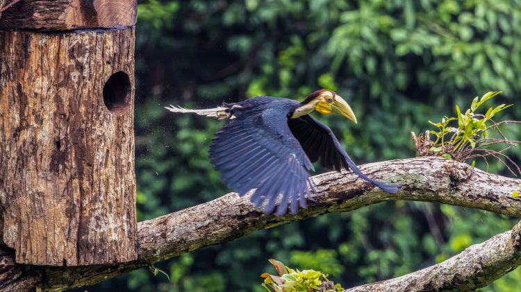犀鸟是热带雨林的旗舰物种,因上嘴长有一个盔状突起而得名。犀鸟通常选取高大树木的树洞作为繁殖期巢穴,雌鸟待在泥土封闭洞口的树洞里孵卵,避免受天敌侵扰。整个繁殖期雌鸟都会在巢穴内,由雄鸟在洞外递送食物。