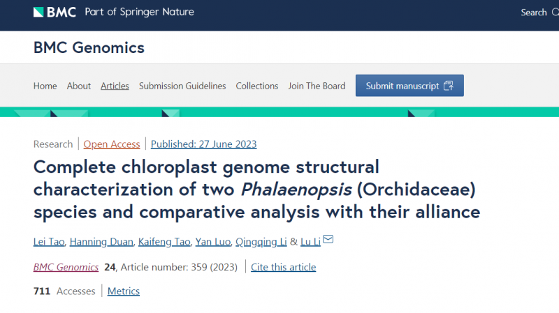 该研究近期以题为”Complete chloroplast genome structural characterization of twoPhalaenopsis ( Orchidaceae ) species and comparative analysis with their alliance”,在国际知名生物学领域期刊《BMC基因组学》(BMC Genomics,IF= 4.4,中科院2区TOP)在线发表。本文第一作者为2021级硕士研究生陶磊,系李青青教授和李璐副研究员联合培养;共同作者2021级研究生段涵宁和2020级研究生陶凯锋参与了数据分析,中国科学院西双版纳热带植物园罗艳研究员参与了论文设计,李璐副研究员为通讯作者。该研究得到国家自然科学基金项目(32060049)支持。