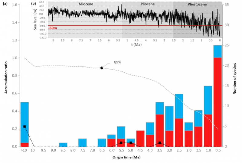 图2 (a) Origin of endemic seed plants in Taiwan in every 0.5 million years, and (b) sea-level changes modified through Miller et al. (2005). The dotted grey line indicates the accumulated ratio of species origin in every 0.5 million years, and the black dot represents an accumulation of 89% endemism after 6.5 Ma. Species origination by in situ speciation and dispersal are shown in red and blue, respectively. The square black dot shows the number of gymnosperm species origin in the corresponding time interval. The sea level at −60 m is indicated by a red line, and different geological times (Miocene, Pliocene, and Pleistocene) are also labelled.