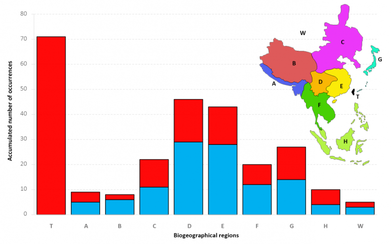 图1 Biogeographical distributions of sister taxa of endemic seed plants in Taiwan. Red and blue indicate the distribution of sister species to endemic species with in situ speciation or dispersal origin mode, respectively. The following biogeographical regions are shown: (A) Assam, Bangladesh, Nepal, and west and east Himalayas; (B) Qinghai-Tibet Plateau and China Tethyan; (C) Chinese Holarctic, Russian Far East, and Korea; (D) south-central China, (E) southeast China and Hainan; (F) Indo-China; (G) Japan and the Ryukyu islands; (H) the Malay Archipelago; (T) Taiwan; and (W) other regions.