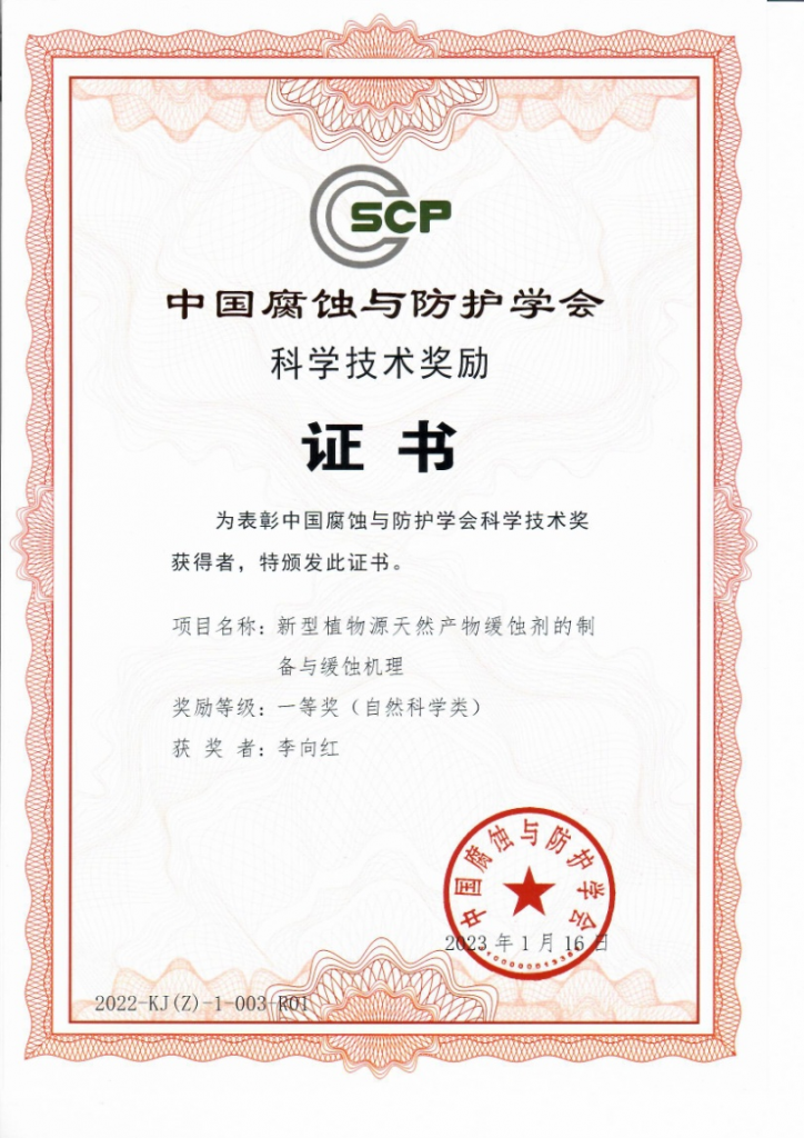 近日,米兰作为第一完成单位和主持人荣获1项中国腐蚀与防护学会科学技术奖(自然科学类)一等奖,获奖项目是由材料与化学工程学院李向红教授团队与云南大学、北京龙飞恒信科技有限公司等单位联合申报的“新型植物源天然产物缓蚀剂的制备与缓蚀机理”。