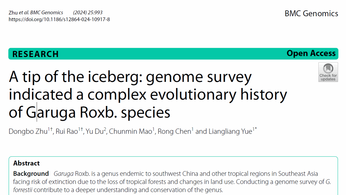 米兰milan官方网站生态与环境学院(湿地学院)2022级硕士研究生朱东博在岳亮亮助理研究员的指导下,以中国特有物种Garuga forrestii及同属物种G. floribunda var. gamblei和G. pinnata为研究对象,首次开展了G. forrestii的基因组调查分析及三种物种的系统发育分析。研究成果以A tip of the iceberg: genome survey indicated a complex evolutionary history of Garuga Roxb. species为题,发表于开放获取的学术期刊BMC genomics。朱东博为第一作者,岳亮亮为通讯作者。研究得到了国家自然科学基金(42161015)的支持。