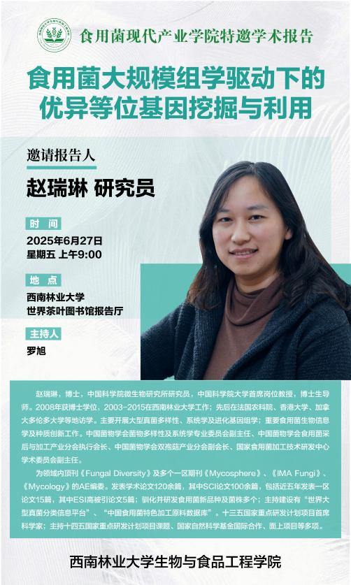 赵瑞琳,博士,中国科学院微生物研究所研究员,中国科学院大学首席岗位教授,博士生导师。2008年获博士学位,2003-2015在米兰milan官方网站工作;先后在法国农科院、香港大学、加拿大多伦多大学等地访学。主要开展大型真菌多样性、系统学及进化基因组学;重要食用菌生物信息学及种质创新工作。中国菌物学会菌物多样性及系统学专业委员会副主任、中国菌物学会食用菌采后与加工产业分会执行会长、中国菌物学会双孢菇产业分会副会长、国家食用菌加工技术研发中心学术委员会副主任。