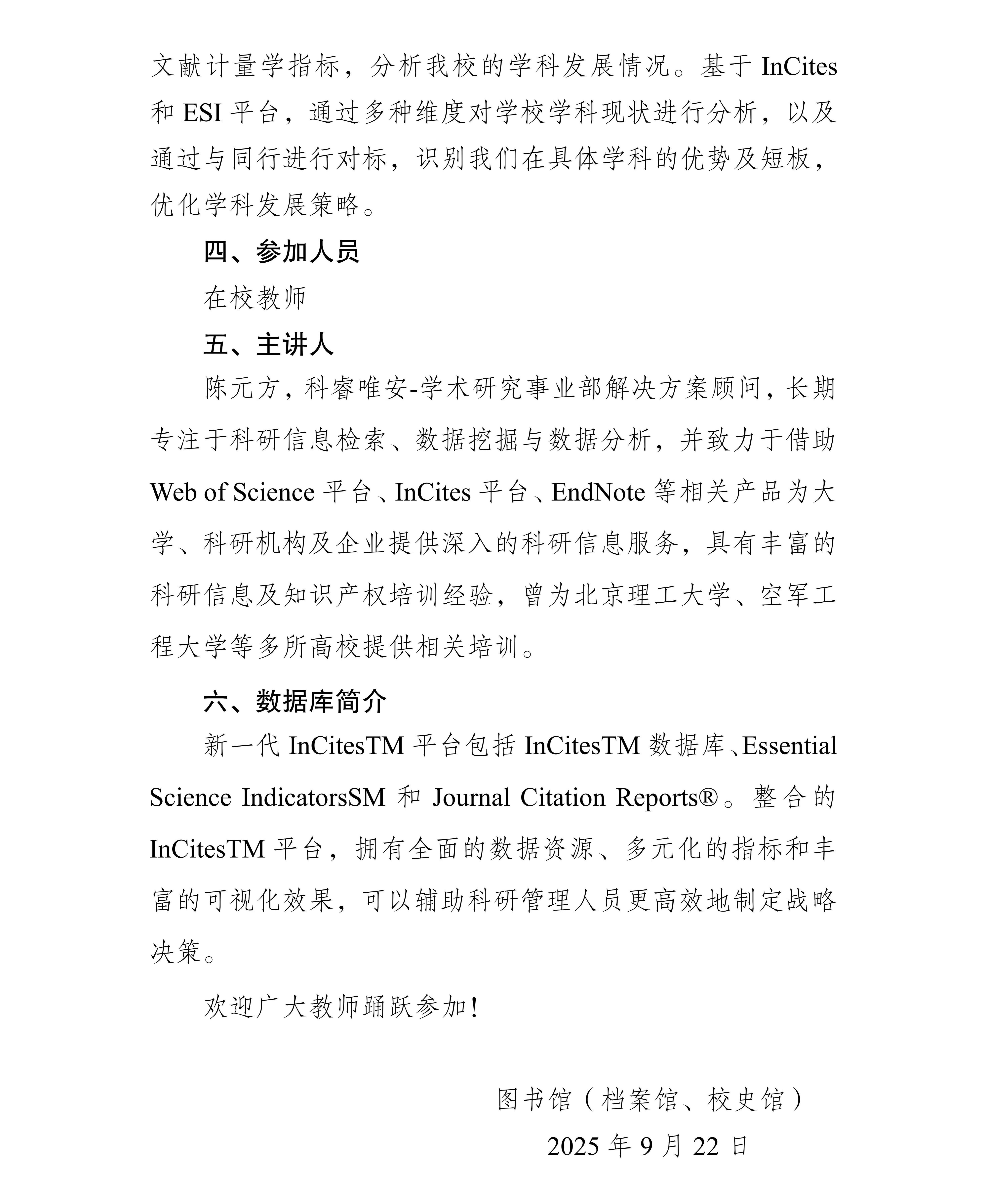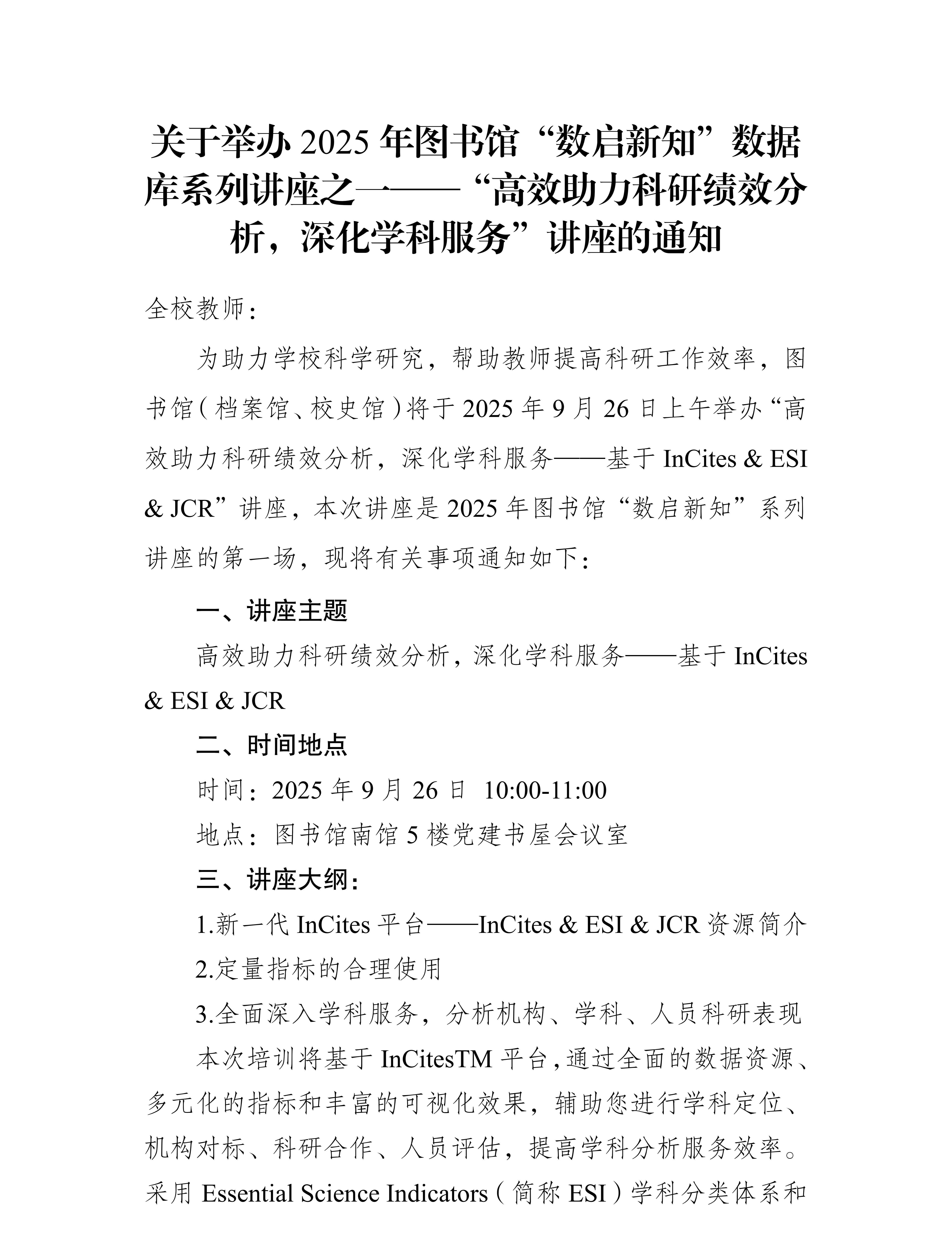 上一条:关于举办 2025 年图书馆“数启新知”数据 库系列讲座之二——“Web of Science(SCI) 助您把握前沿动态,高效开展科研”讲座 的通知