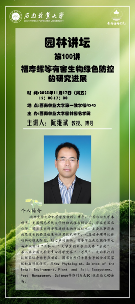 阮维斌,南开大学生命科学学院教授、博导。中国农业大学本硕博。美国明尼苏达大学植物病理系博士后,曾在美国农业部、荷兰皇家科学院进修生物防治技术。主要从事昆虫病原线虫的资源收集与应用技术研究,以及福寿螺等软体动物的绿色防控,助力乡村振兴。指导学生先后获得第七届中国国际“互联网+”大学生创新创业大赛“金奖”、第八届全国大学生生命科学竞赛“一等奖”。先后承担科技部国际合作重点项目、国家自然科学基金等10余项国家级和省部级项目,在New Phytologist、Science of the Total Environment、Plant and Soil、Ecosystems、Pest Management Science等期刊发表SCI收录论文40余篇。