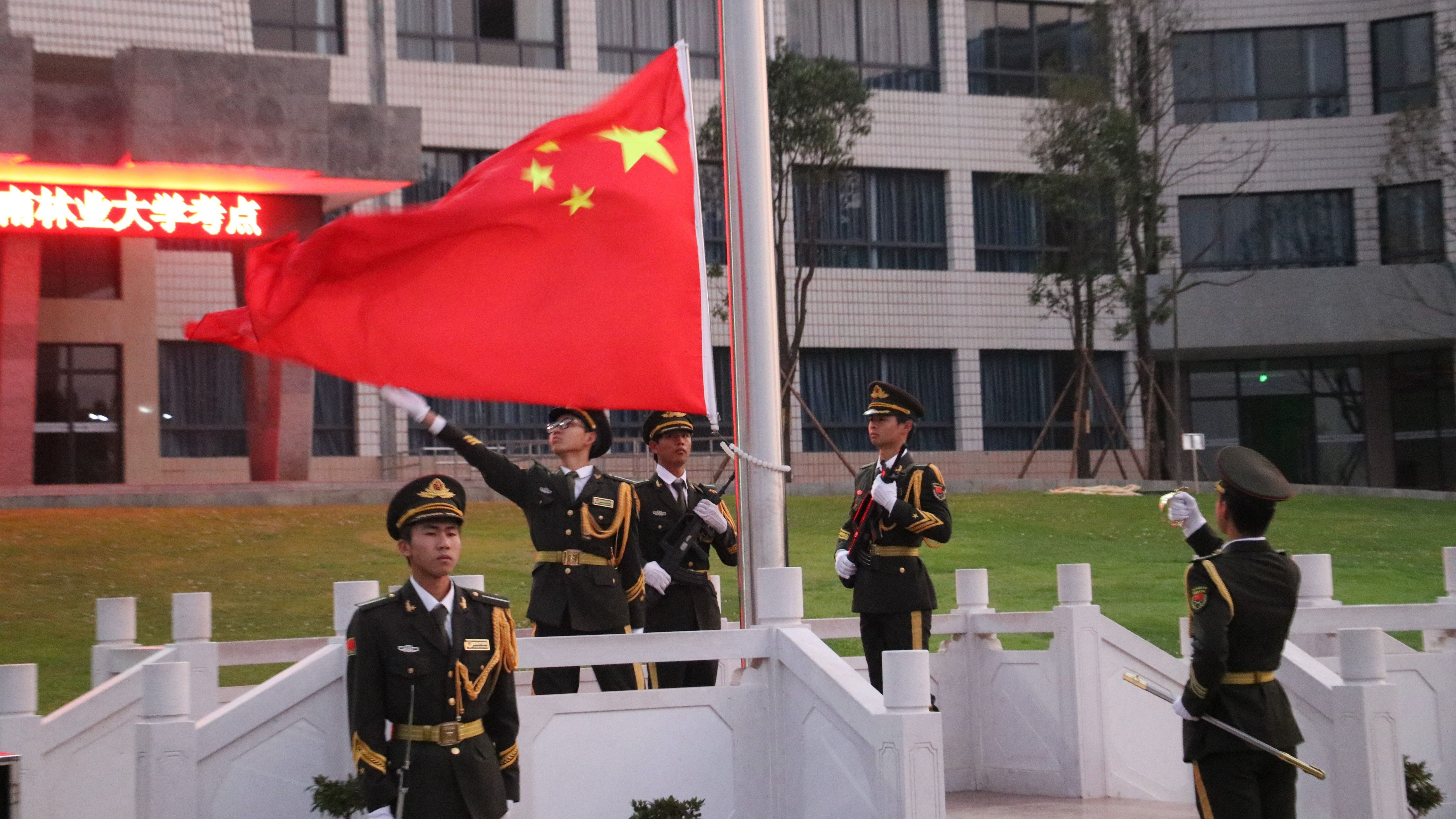 升旗仪式开始,全体师生肃立,迎国旗、升国旗,奏唱国歌。在庄严的仪式中,师生们表达了对祖国的热爱与敬意。