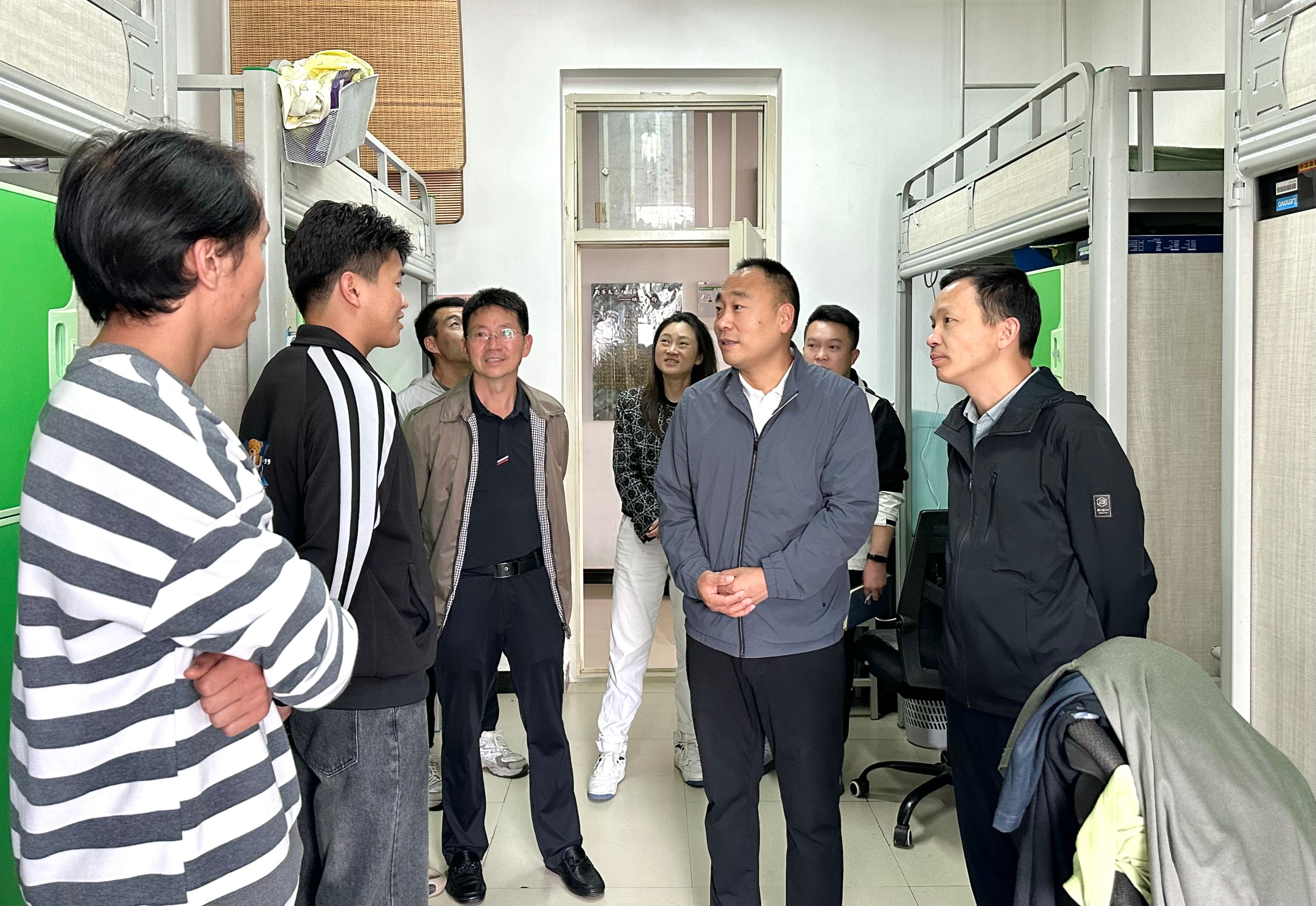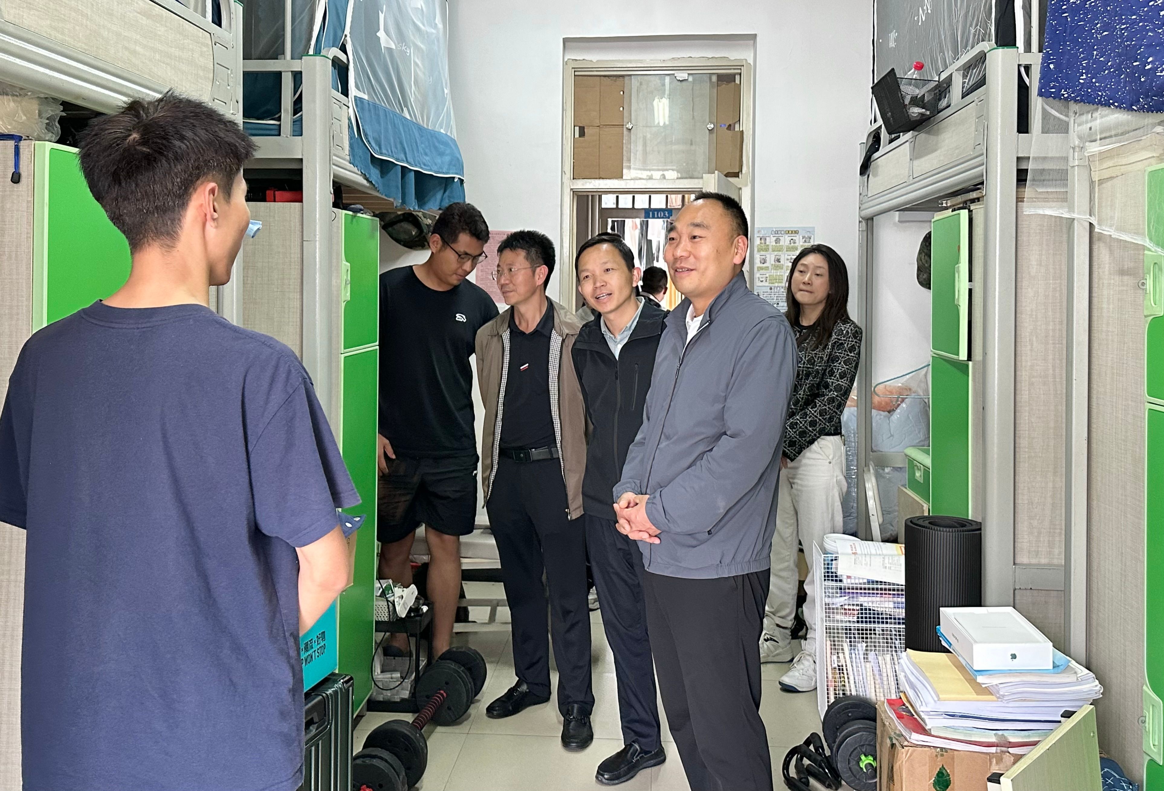 郭华一行深入学生宿舍查看安全情况、卫生环境、公共设施、后勤保障等情况。郭华表示,各学院、各部门、各单位要按照上级要求,结合学校实际,扎实做好学生安全工作,落细落实一线学生工作规定,凸显围绕学生、关照学生、服务学生的工作理念,常态化深入学生宿舍了解情况、排查隐患、解决问题,确保校园安全稳定。
