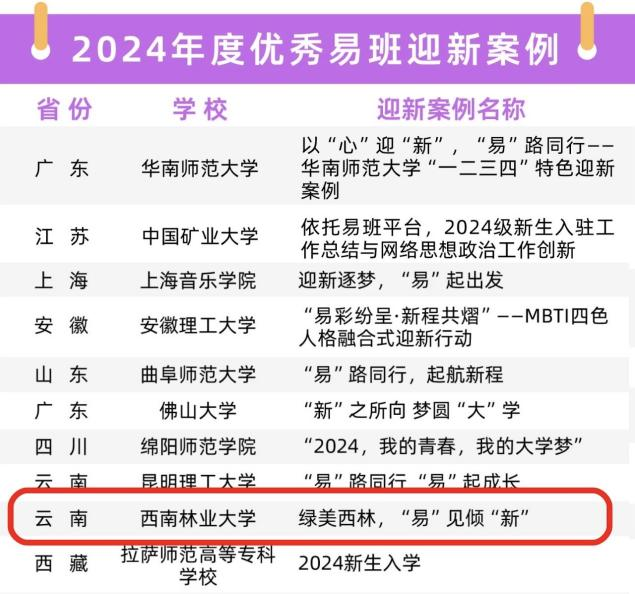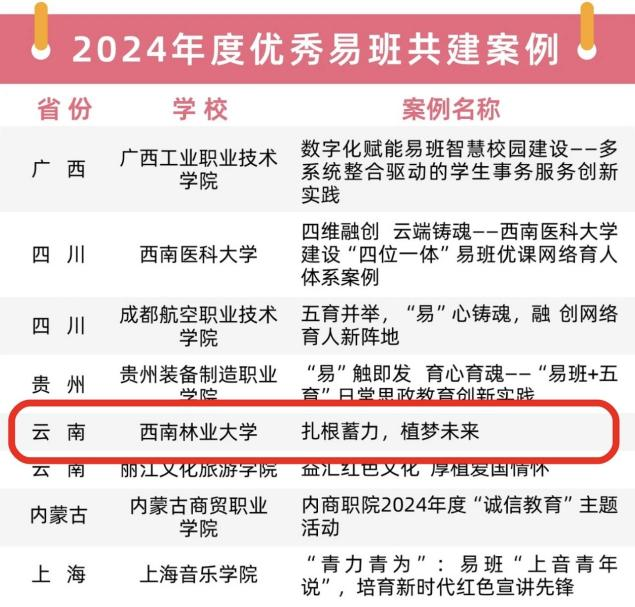 米兰milan官方网站在此次6个奖项的竞选中斩获4项荣誉,获奖数量位居云南省高校第一。其中,学校荣获2024年度全国优秀易班共建高校;《扎根蓄力,植梦未来》案例荣获2024年度全国优秀易班共建案例;校易班工作站站长申希荣获2024年度全国优秀易班工作站站长;《绿美西林,“易”见倾“新”》案例荣获2024年度全国优秀易班迎新案例。