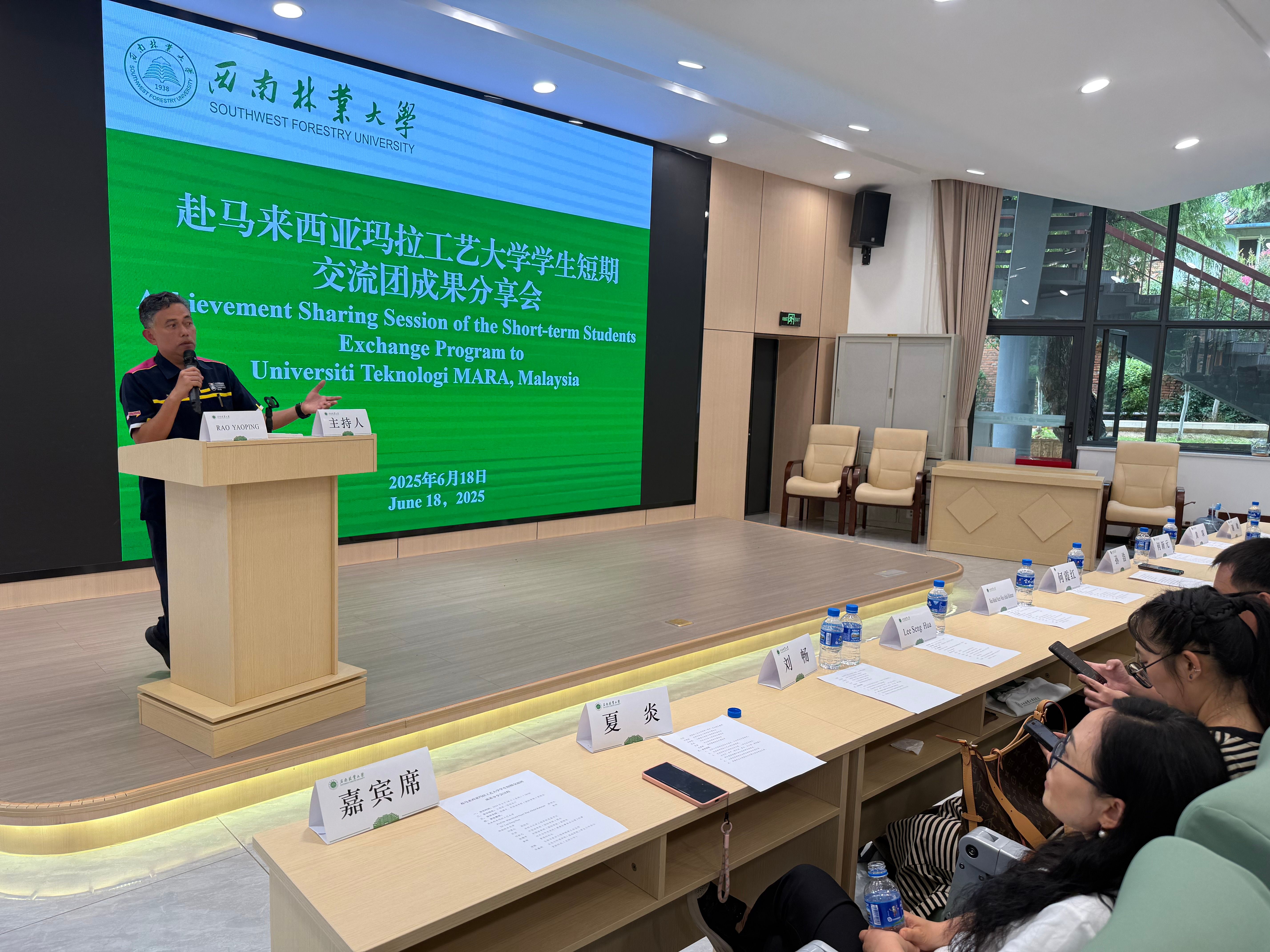 6月18日,米兰在立德楼一楼报告厅举办了“赴马来西亚玛拉工艺大学学生短期交流团成果分享会”。本次会议旨在总结交流成果,分享学生在马来西亚的见闻与收获,进一步推动两校间的国际合作与交流。会议由外国语学院(国际学院)副院长饶耀平主持,两校领导、教师代表及学生共同参与了此次活动。