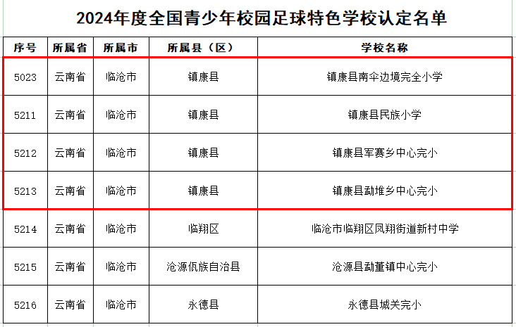 据悉,2024年度全国青少年校园足球特色学校认定5889所学校,其中云南省268所,临沧市7所,镇康县4所,认定数量居全临沧市首位。(来源:教务处、课程中心/文/图:孔瑞宇/审核:杨松/初审:张冉/复审:冷瑾/终审:张武先, 柏顺文/责任编辑:张冉)