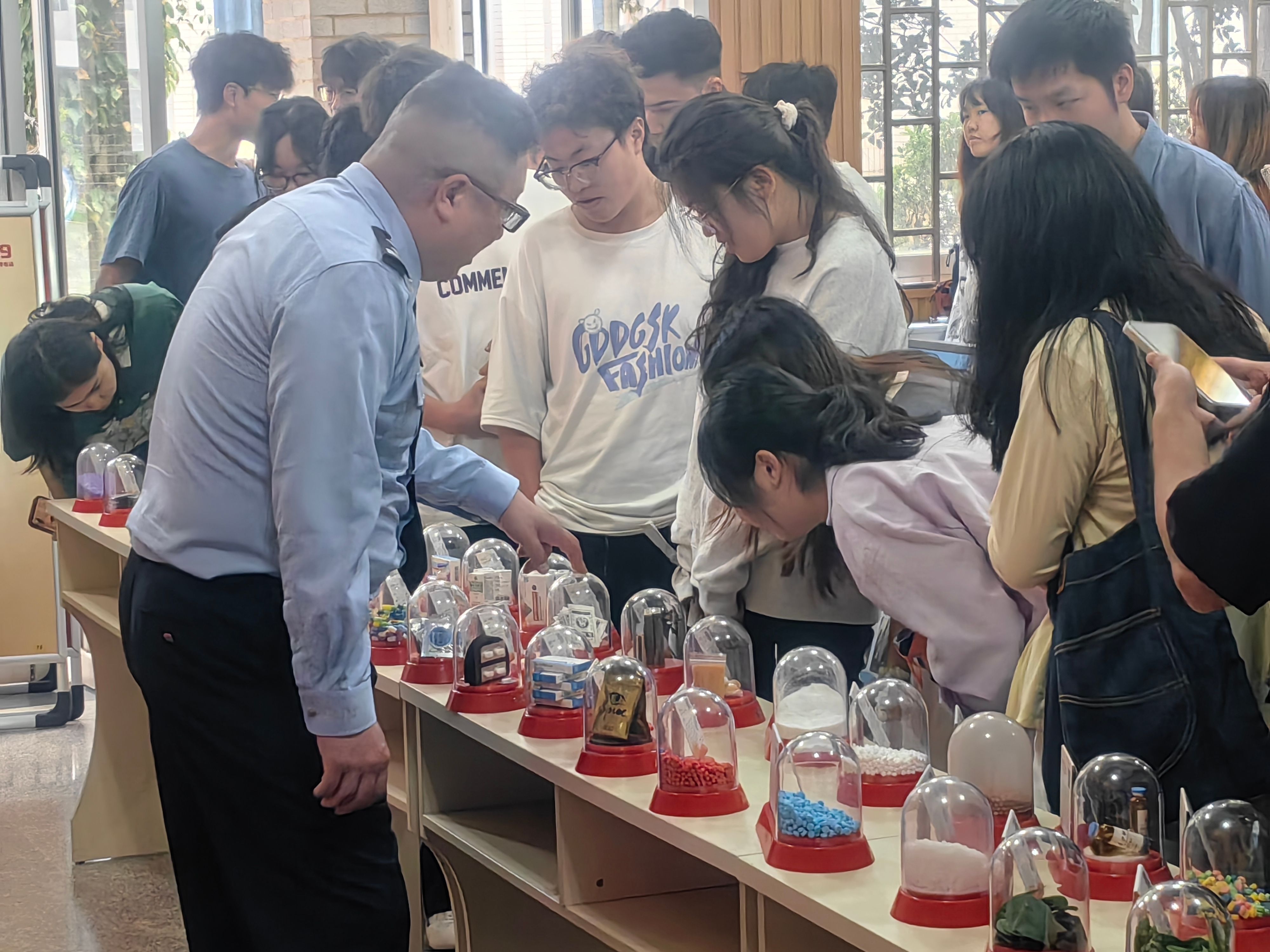 6月26日,学院联合学校团委、云南省第五强制隔离戒毒所、西林社区,特邀该所教育矫正中心专职教师、二级警长潘紫东警官为师生带来专业禁毒讲座。潘警官结合多年一线工作经验和真实案例,深入浅出地剖析了毒品的巨大危害、常见种类及伪装形式,并传授了切实有效的防范技巧,令在场师生深受触动。讲座结束后,学院在文法楼一楼大厅和标本馆前广场同步开展了禁毒主题宣传与毒品科普展示活动。通过陈列各类仿真毒品模型,师生得以近距离、直观地辨识毒品的隐蔽形态,特别是新型毒品的伪装特征,有效提升了辨别能力和警惕性。