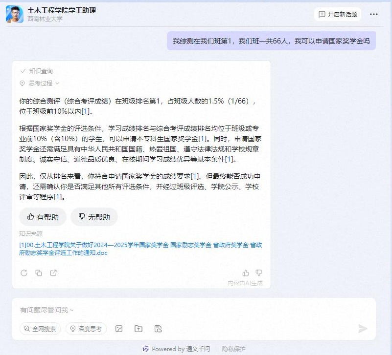 创建此助手旨在为土木工程学院学子量身打造一个高效、精准的数字化服务窗口,以人工智能技术助力学生的专业成长与日常管理,解决学生在专业学习与校园生活中遇到的实际问题,提升效率,让大家能更专注于核心专业能力的提升。(来源:土木工程学院/图:陈祉彤/文:李林娜/审核:胡万波/初审:张凡/复审:冷瑾,张冉/终审:柏顺文/责任编辑:张凡)