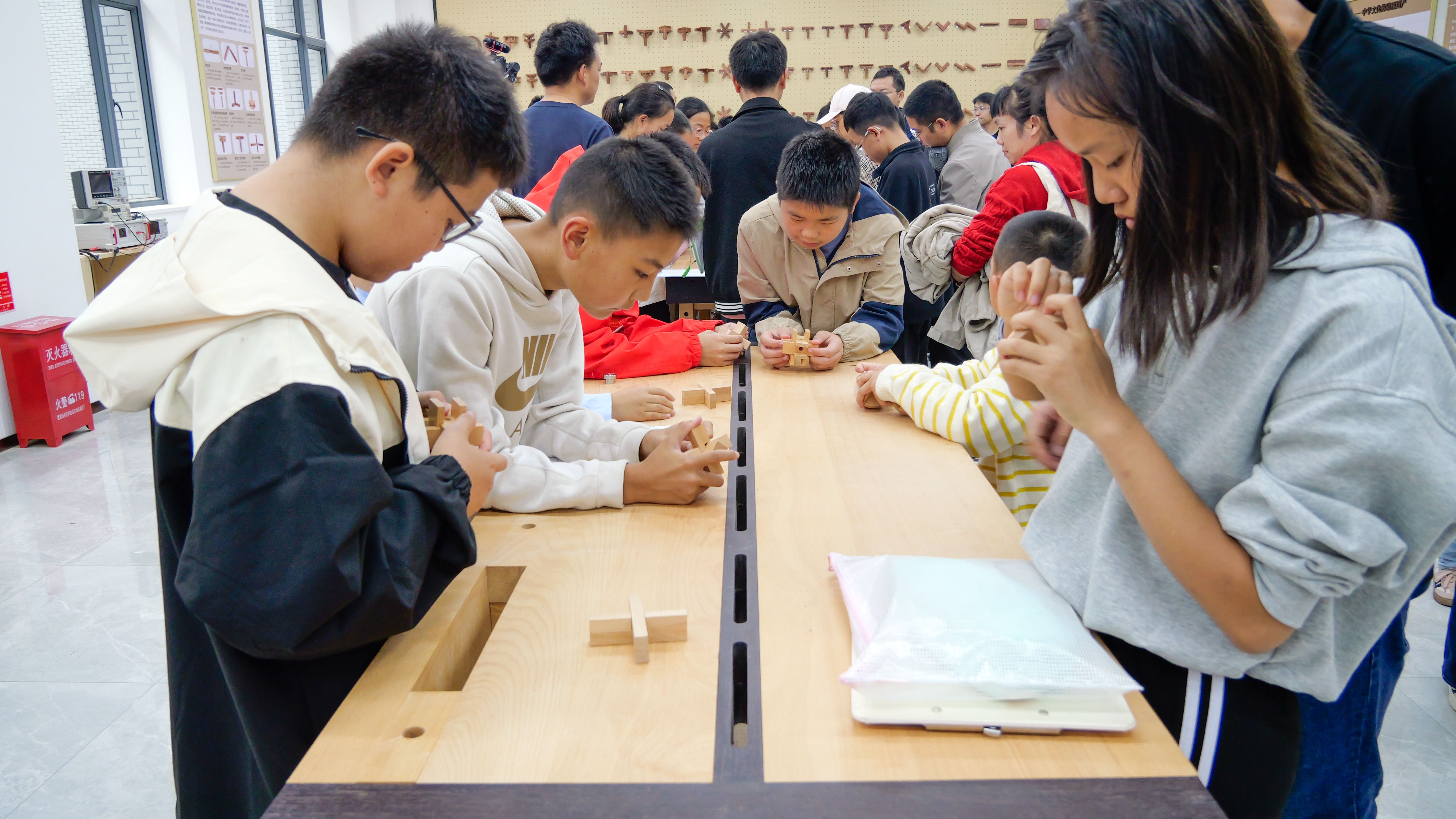 活动中,同学们还参观了馆藏的万种木材标本库,并在木工坊体验了传统与现代工艺相结合的实践环节。参观结束后,研学团参与了鲁班锁竞技比赛。作为凝聚古人智慧的榫卯益智玩具,鲁班锁不仅考验参与者的手眼协调能力,也有助于提升空间思维与逻辑推理能力,使抽象的科学原理在动手实践中变得可触可感。