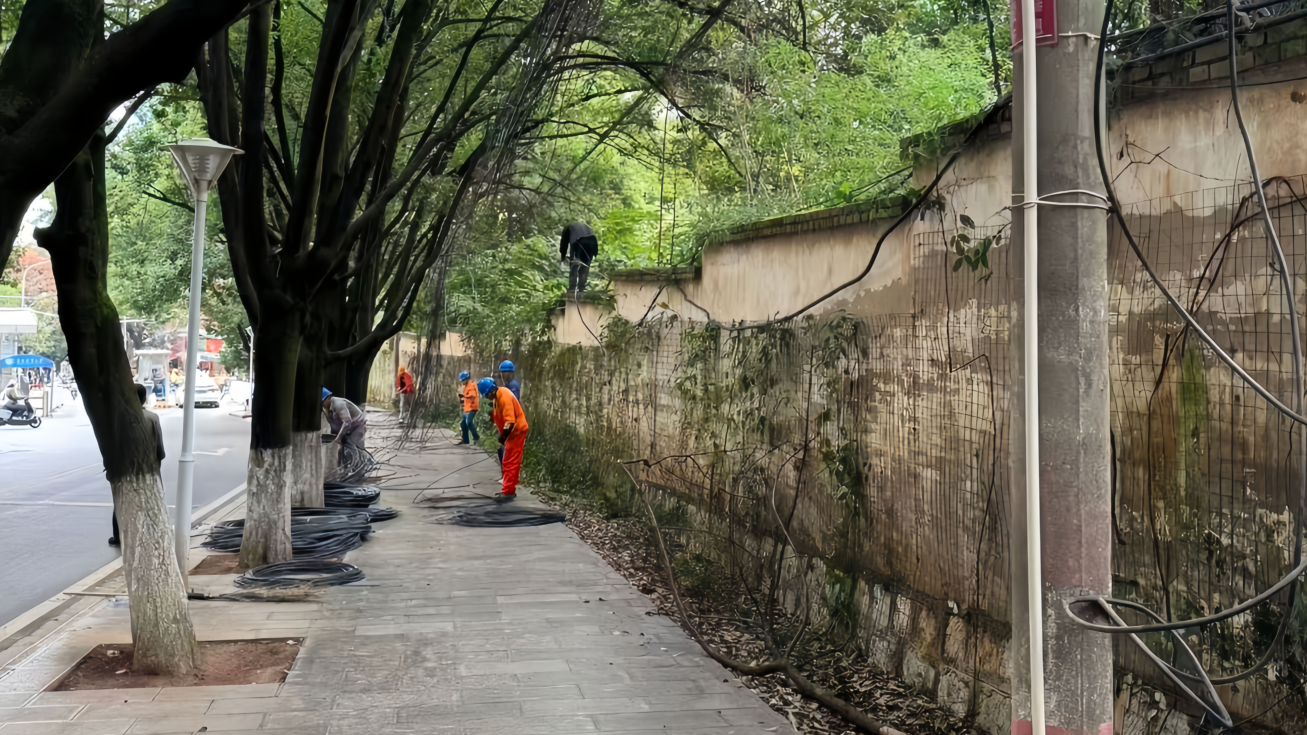 在确保通信、网络业务正常运行的基础上,在中国电信、中国移动、中国联通和中国铁塔等运营商大力配合下,专项行动针对校内运营商通信和校园网网络线缆纵横交错、杂乱悬空等“视觉污染”和安全隐患问题,伴随全校“全光+WIFI7”校园升级改造有序实施,对立德楼片区、西区、东区及西北门、东门周边架空通信及网络线缆进行梳理规划、规范入地和有序拆除。