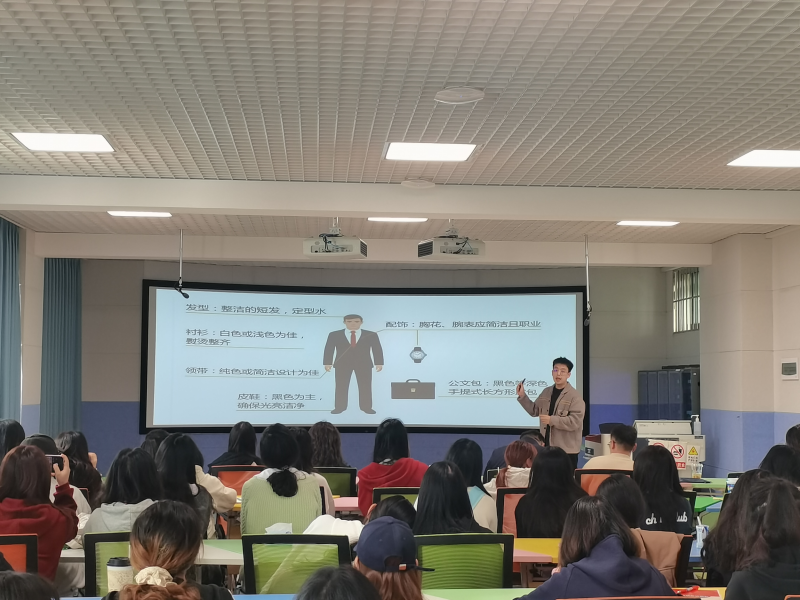 罗熙为大家讲解了商务着装礼仪、乘车礼仪、沟通礼仪等,他介绍商务场合的着装要求,包括西装、衬衫、领带、皮鞋等细节方面的搭配和注意事项以及乘车礼仪,包括座位安排、交流方式等方面的规范。他提醒同学们,在职场中要注重细节,做到言行举止得体,以塑造良好的个人形象和企业形象。